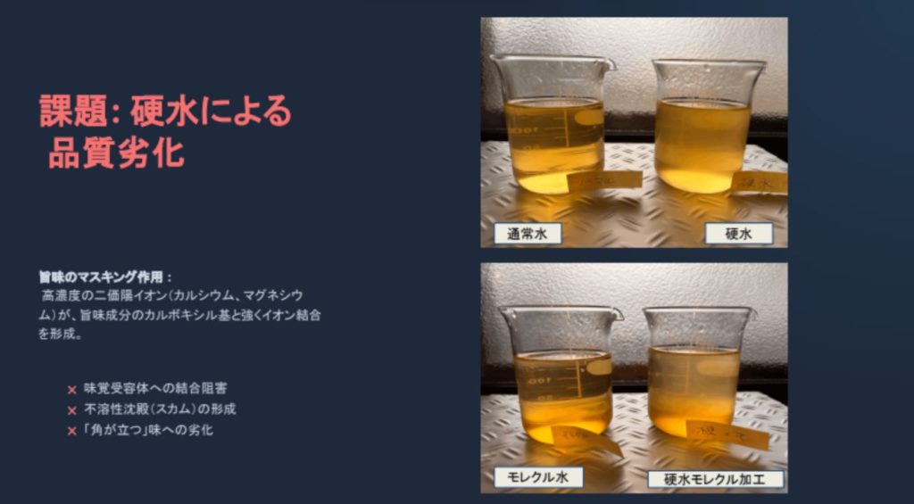 使用したのは、硬度の王様とも言える「高硬度鉱泉水」。このガチガチの硬水をMOLECULEで整流し、出汁を引いたのだ。これは単なる料理実験ではない。「溶媒和能(ものを溶かす力)」の限界測定である。