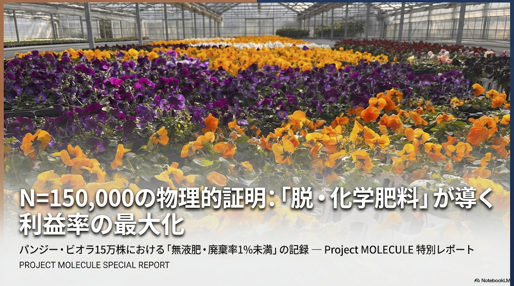 NotebookLMを通じて得られた最新の検証データ、そして現場の生きた証拠(育苗全工程における2.5ヶ月間の無肥料記録)を読み解き、私は確信した。Project MOLECULEが提唱してきた「物理的整流」というアプローチが、ついに15万株という圧倒的なスケールで、既存の農業常識を打ち破る「物理の証明」を完遂したのだ。